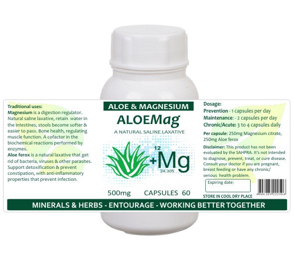 Aloemag is a herbal and mineral dietary supplement designed to support occasional slow bowel movement. By combining magnesium citrate with traditionally used aloe ferox, it gently assists in promoting digestive comfort and natural elimination.